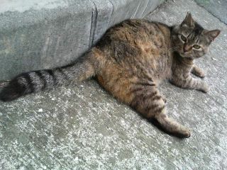 狸のようなしっぽの猫。くつろぎすぎ。